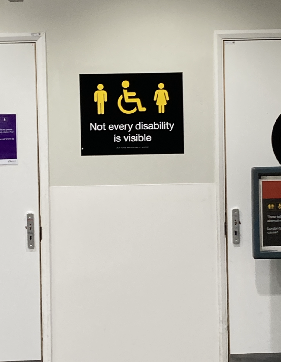 Dagens skilt av en person i rullestol har dessverre skapt misforståelser om at man ikke har rett til å bruke disse tilrettelagte toalettene hvis man går på to ben, noe Elisabeth Karlsen dessverre har opplevd ved flere anledninger. Dette gjør at mange med ikke synlige funksjonsnedsettelser kvier seg for å bruke disse toalettene fordi de opplever både stygge blikk og kommentarer.