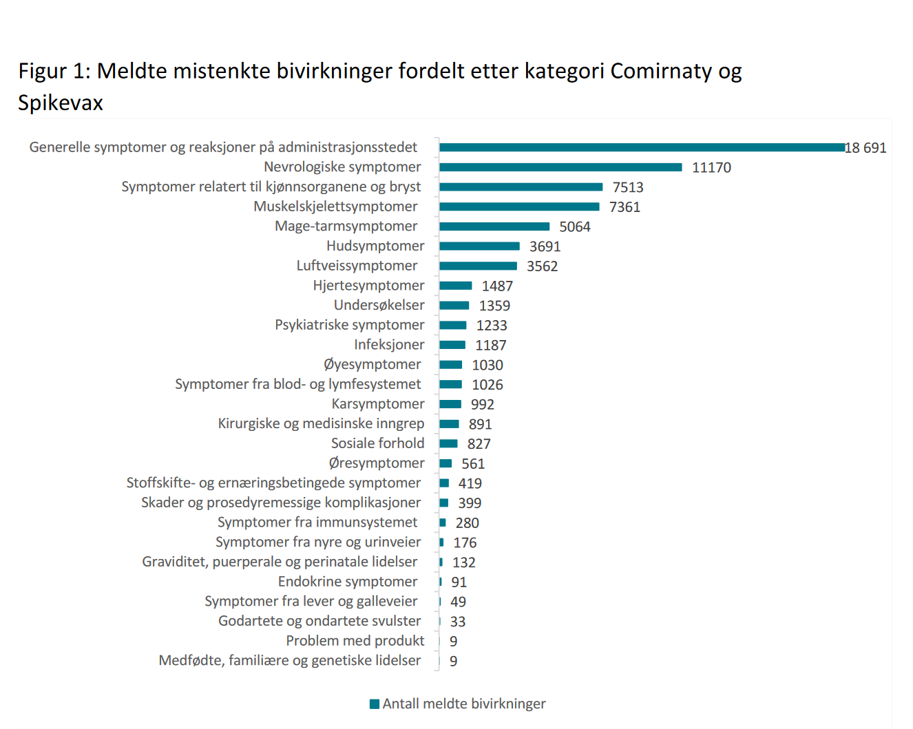 Mistenkte bivirkninger av Covid-19-vaksinen som er rapportert inn til Statens legemiddelverk (per 1. mars 2022):